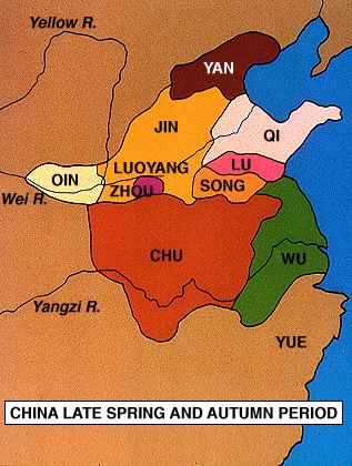 Feudalism is an efficient system of government when the king is strong, the nobles are loyal, and communications are reliable. When this is not the case it is a good formula for lawlessness. The lords of each fief were expected to show their loyalty by making annual visits to the king; when the king was weak or unpopular the lords would stay home, and the worst kings did not even care whether the lords came or not. Lasting more than eight hundred years, the Zhou dynasty was the longest-lived of all Chinese dynasties, but once feudalism was fully implemented, the Zhou kings were no longer strong rulers. The first half of the dynasty (1122-770 B.C., often called the "Western Zhou" period by modern historians) was a period of decentralization, when the kings lost most of their power, and the lords around them not only acquired domains bigger and stronger than the Zhou royal domain, but also ruled them as kings in everything but name (the names would come in the next period). Often the Western Zhou rulers were not able to handle the responsibilities left to them. One spent most of his time exploring the lands beyond the frontiers of his kingdom, looking for the magical places where gods, dragons and spirits lived. Another, Li Wang, was so cruel that the nobles got together and deposed him in 841 B.C.; two of them ruled until the crown prince, grew up. This crown prince, Xuan Wang, won more than one war against the barbarians after he became king (827-782 B.C.), but he was succeeded by the last Western Zhou king, Yu Wang. In 780 B.C., a major earthquake struck, and a soothsayer named Bo Yangfu called it an omen, a sign that the Zhou dynasty was about to fall. This was followed by an eclipse in 776 B.C. But just in case anything else was needed, there was Yu Wang's behavior; he lost whatever respect the nobles might have had for him, by pulling a royal prank. He had a beautiful but unhappy concubine named Baosi, who hardly ever smiled; she gave him a son named Bofu. Enraptured by her looks, Yu Wang divorced Shen, the rightful queen, sent her and the crown prince away, married Baosi, and made Bofu the new crown prince; all this was a violation of custom and a guaranteed offense against the in-laws! Then he tried everything he could think of to make his new wife laugh. When none of the usual jugglers, acrobats, and court jesters could cheer her up, Yu Wang ordered the burning of bonfires outside the city. In those days bonfires were used as warning beacons, to quickly alert the countryside of a crisis in the capital. When the nearest lords saw the bonfires, they mobilized their troops and alerted the lords that were farther away. Soon the entire army was converging on Hao, expecting to find barbarians attacking the city, but when they got there they found no crisis at all. The sight of all those soldiers looking very silly because they had come for nothing caused Baosi to clap her hands and burst into laughter; Yu Wang was pleased that his trick had worked, but the soldiers went home very angry. Not long after that the father of the previous queen revolted, and he called in the Xiongnu as allies. When he heard about the danger, Yu Wang again ordered the lighting of the beacon fires, but just as in the story of the boy who cried "Wolf!," nobody came this time. The loyal nobles chose to stay home rather than be summoned for the whims of a woman; the capital was taken, Yu Wang and Bofu were killed, and the concubine was led into captivity. The next king, Ping Wang, fled from the ruined city of Hao to a more centrally located and better protected city, Luoyang. It was also east of Hao, so we call the second half of the Zhou dynasty the Eastern Zhou period. The leader of Qin, a non-Chinese tribe, provided the guards to escort the king to the new capital, and Ping Wang rewarded the Qin by letting them have part of the Zhou royal domain in the west, since he could no longer administer it directly. This move elevated the Qin's status from that of friendly barbarians to serious contenders for supremacy over all of China. What remained of the royal domain was now surrounded by other Chinese states, and the kings after Ping Wang found that they could no longer enlarge that domain, because that would mean trampling on the rights of loyal vassals. Whereas the king's influence was limited during the Western Zhou period, during the Eastern Zhou period his power disappeared completely. Reduced to a figurehead, the king found that the only job left for him was the series of archaic religious duties he continued to perform. Thus, when the aggressive lords of Qin deposed the last Zhou monarch in 255 B.C., it made little difference to the rest of the country. We call the first 289 years of the Eastern Zhou period (770-481 B.C.) the "Spring & Autumn Era," after a contemporary book covering the politics and history of that time. During this period the rulers of the states stopped looking to the king for authority; in fact, as early as 750 B.C. the ruler of a powerful southern state, Chu, started calling himself king, as if the wild men on the frontier had replaced the Zhou as the real rulers of China.(10) In the Spring & Autumn Era, we know for sure that 148 states existed, and there could have been as many as 250. Simple math shows that 170 states can form 10,878 ((148*147)/2) possible combinations of two-state alliances; what an opportunity for intrigue and conflict! The most successful states were those on the periphery of China; these states could enlarge themselves by taking barbarian-held lands without drawing protests from other Chinese states. Equally important, the frontier states were less conservative than the rest, and more willing to experiment with new ideas. As a result, the three most important states to rise up with the dissolution of the Zhou dynasty were all on the frontier: Qi in the east (Shandong), Chu in the south (Hubei and Hunan), and Qin in the west (Shaanxi).
