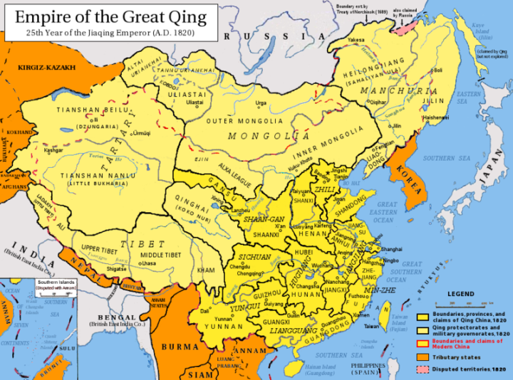 Yongzheng was in turn succeeded by Qianlong, who not only ruled for as long as Kangxi (1735-96), but was the last great emperor in Chinese history. When a Mongol tribe that was still independent gave him trouble in the middle of the century, Qianlong went forth and destroyed them (1755-58). Next, Manchu/Chinese armies marched west and exterminated the Dzungars, the tribe currently living in northern Xinjiang. By 1760 Qing authority had been established all over the Tarim basin; China's western frontier was pushed to Lake Balkhash in Central Asia. The remaining Central Asian khanates--Khokand, Kazakhstan, Bukhara, Badakhshan and Afghanistan--became irregular tributary states. So did Nepal, which was humbled by a Qing expedition after the Gurkhas had meddled in Tibetan affairs too often. At home, Qianlong surpassed all other Qing emperors in his sponsorship of culture. Some 15,000 calligraphers were employed making handwritten copies of 10,000 books for the nation's six largest libraries. The most famous of these was The Complete Works of Four Treasuries, where 300 scholars edited/summarized some 3,500 works on the Chinese classics, a total of 36,000 volumes. The most useful of the Western sciences, astronomy and mathematics, were also given favorable treatment. Hundreds of poets and painters were subsidized to exalt Chinese achievements. No books or art that criticized the Manchus was permitted, however, and with good reason. As in Yuan dynasty days, Chinese scholars were becoming nostalgic for the times when the Chinese ruled themselves. Secret societies, especially the White Lotus movement which had founded the Ming dynasty, were also enjoying a comeback. Qianlong managed to keep a lid on dissent for his entire reign, but the emperors of the nineteenth century would see their troubles grow exponentially on account of it. The Manchus inherited the Confucian disdain for merchants and commerce. Most of the permitted foreign trade was done under the tribute system, which was used as a means of expressing China's cultural and political supremacy over everyone else. Ambassadors would come to the imperial court in Beijing, and show their submission by kowtowing (bowing on hands and knees and knocking one's head on the ground) three times. Then the ambassadors would deliver the wares of their lands, calling them gifts; the emperor would respond by letting them return home with a sizeable quantity of Chinese products. During the Qianlong era Burma, Siam, Laos, Vietnam, Central Asia, Nepal, Korea and the Ryukyu islands all sent tribute. Russia traded in a similar fashion, by putting ambassadors in charge of their commercial missions. And while other Europeans were eager to trade, the Chinese continued to treat them like lepers. English, Spanish, Portuguese, French, Dutch and American merchants were only permitted outside of Macao during the months when there was tea for them to buy (April to September), and even then they could only go to Canton. In addition they were forbidden to bring their wives with them; they were not allowed to learn Cantonese, the local Chinese dialect; they could not travel "in droves of more than ten at a time," and they always had to be accompanied by a Chinese interpreter, who was held responsible for their good behavior. Naturally the Europeans resented all these restrictions, but there was little they could do about it as long as the Chinese did not really want their business. The main reason why the Chinese traded at all was because the Europeans paid for what they bought with silver--usually Spanish coins that came from Mexico via the Philippines. Since the Chinese economy was still cash-poor (see Chapter 4, footnote #1 and footnote #11), these silver transfers gave considerable relief. The British thought they could loosen the restrictions placed upon them if Britain and China had formal diplomatic relations, so in 1793 they sent a special mission, led by Lord George Macartney, to bring a formal proposal for the establishment of a permanent embassy in China. Like the tribute-bearers of other nations, Lord Macartney brought numerous gifts to help his cause, the most modern products of Western technology. There were modern firearms and saddles, chiming clocks and Derby porcelain, crystal chandeliers, telescopes, and a working mechanical model of the solar system. There was even a hot-air balloon, complete with pilot. When Macartney went before the emperor, he was preceded by a Chinese official holding a banner that read "Tribute-Bearer from the Red Barbarians." The emperor received the mission in an informal setting, the Garden of Ten Thousand Trees at Jehol, to limit any breaches of protocol Western ignorance might cause. But Qianlong, now a shrewd octogenarian, was unimpressed by what he saw. He was not about to sign an agreement on account of some fancy foreign souvenirs. Indeed, he was not even sure where Britain was, nor did he greatly care. He treated the visitors with every courtesy, but never discussed with them the reason why they had come. After several weeks of frustration, Macartney and his retinue left, with only a letter from Qianlong to England's King George III to show for their efforts. And even the letter was not worth the trouble Lord Macartney went to; in it the emperor conceded nothing. "Our ways have no resemblance to yours," Qianlong said. "As your ambassador can see for himself, we possess all things. I set no value on objects strange or ingenious, and have no use for your country's manufactures." While Macartney was there, it went noticed that he had refused to kowtow to the emperor; most Westerners had too much pride to perform such a humiliating act.(8) But the court archivists, fearful that a bad precedent might be set, recorded that he had kowtowed; thus Britain supposedly acknowledged the supremacy of China, in fiction if not in fact. In the next century this blindness would cost the Middle Kingdom dearly. In Qianlong's day, China was s