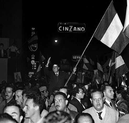 A Brazilian WW2-era pilot, with the Leaning Tower of Pisa behind him. The second term given to Vargas by the constitution was due to expire in 1943. When 1943 arrived Vargas announced that because of the emergency caused by World War II, he must stay in office, but as soon as possible there would be a new election. In 1944 he made a similar announcement. Obviously he wasn't practicing what he preached, fighting for democracy in Europe while running a fascist-style state at home. When the war ended he could not postpone elections any longer, so he scheduled them for December 2, 1945, made political parties legal again, formed two parties to promote himself, and released the Communist leader, Luís Carlos Prestes, from jail. A grass-roots movement also appeared, called the Queremistas because its members kept saying "Queremos Getúlio" ("We want Getúlio"); many thought Vargas started this movement, to make people think the vast majority of the population was on his side. Most disturbing, Vargas was required by law to resign before the elections, so the incumbent would not have an advantage over the other candidates, but he showed no signs of stepping down as 1945 went on. When Vargas appointed his brother chief of police in Rio de Janeiro, the military acted. A delegation of military men confronted Vargas in October 1945, to tell him that his time as president was up, and that he would not be allowed to run for president in the next election. Vargas thought briefly about fighting to stay, and then resigned. We said earlier that Vargas didn't carry a grudge, and he showed it here by endorsing Eurico Gaspar Dutra, one of the generals who told him to leave; Dutra won the election and got Vargas' job. Despite his fall from grace, Vargas remained popular. During the next four years he was nominated for senator and elected to that job, though he did not seek it. Overall he acted like he was retired from politics, spending most of his time on his ranch in Rio Grande do Sul.